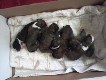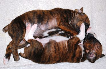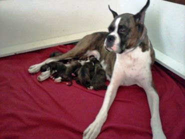 On 10/12/13 Corona delivered her first litter, The Litter of Spirits. She gave birth to 7 beautiful, healthy pups, 4 girls and 3 boys----all brindles. It was a text-book delivery and took a short 5 hours to complete. She was an excellent mother from the very start all the way through the weaning of her babies. She was watchful of her little ones and made sure they behaved as they should!!!