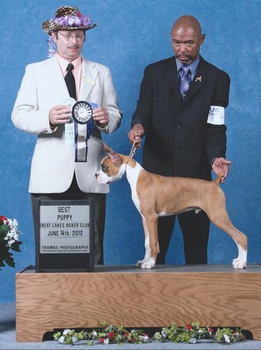 Just shy of 4 months old, Jagger was in his first conformation competition at the Great Lakes Boxer Club Specialty at the UKC Premier in Kalamazoo, Michigan on June 14, 2012. He beat out several other boxer pups to win Best Puppy under Judge Joseph Gruby. Jagger was handled by his owner, Bernard Atkins.